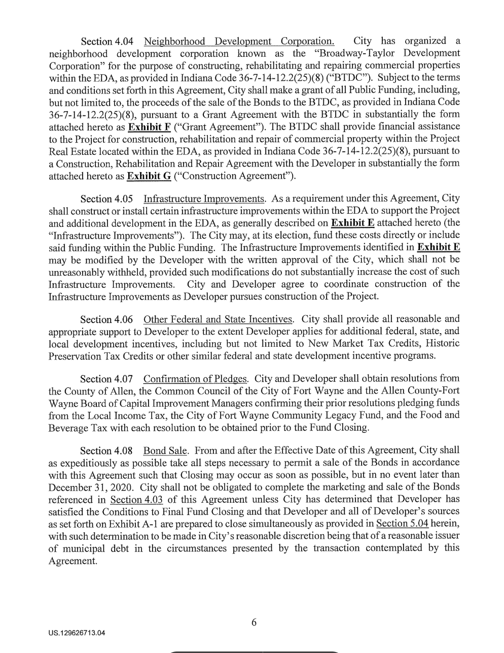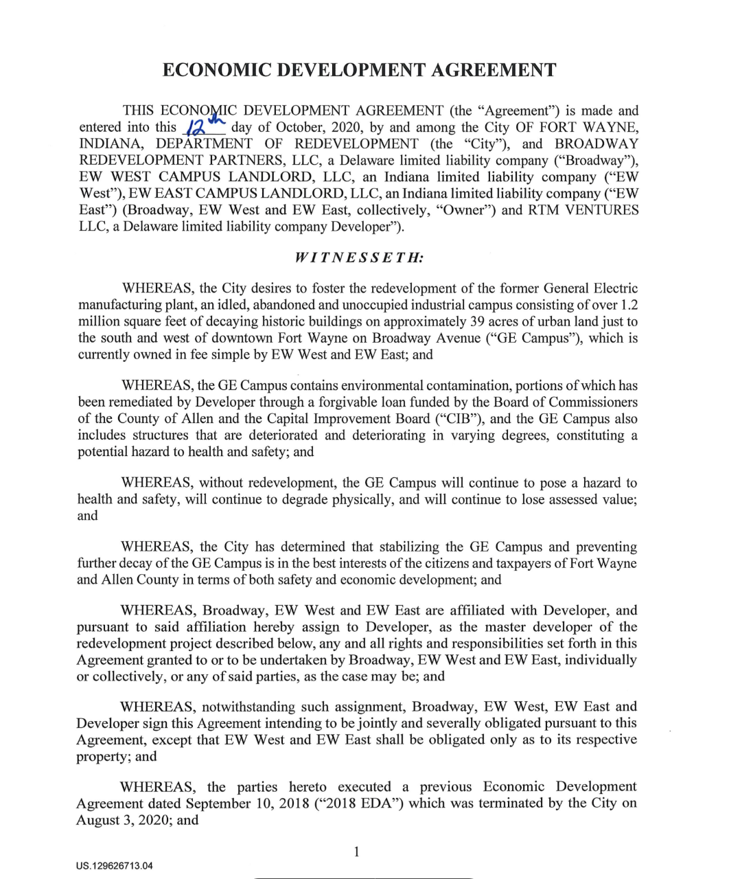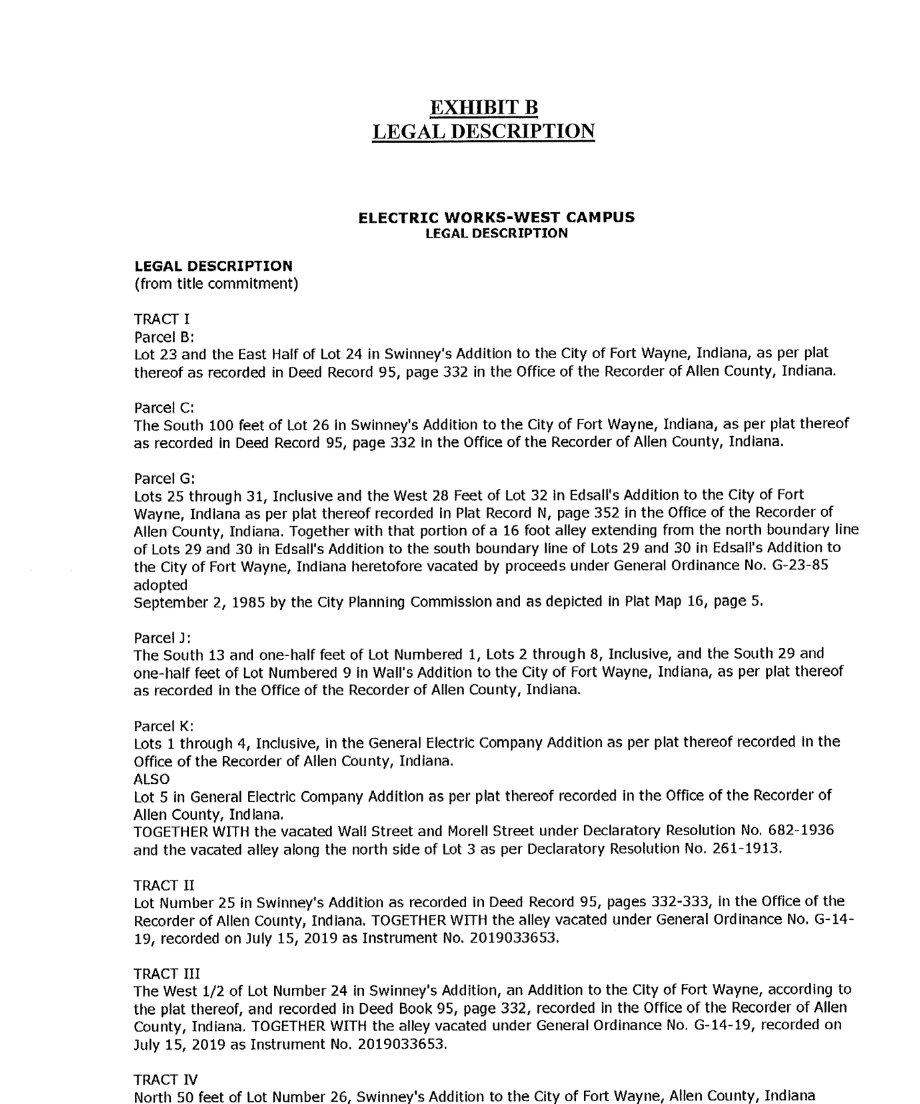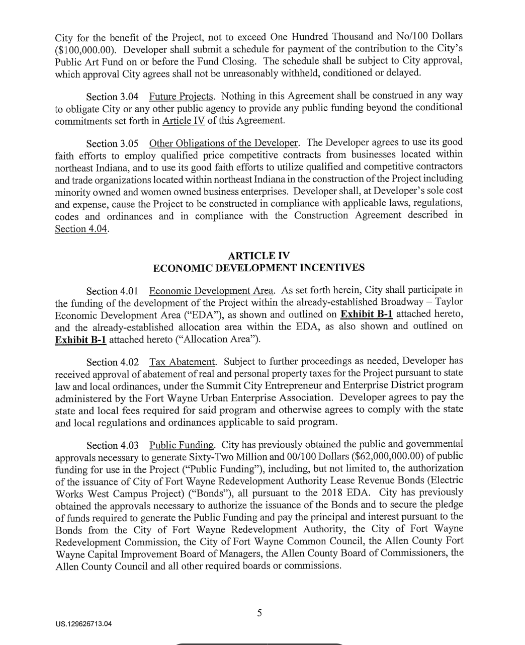 Document: The 2020 Economic Development Agreement between the City of Fort Wayne + Electric Works developers