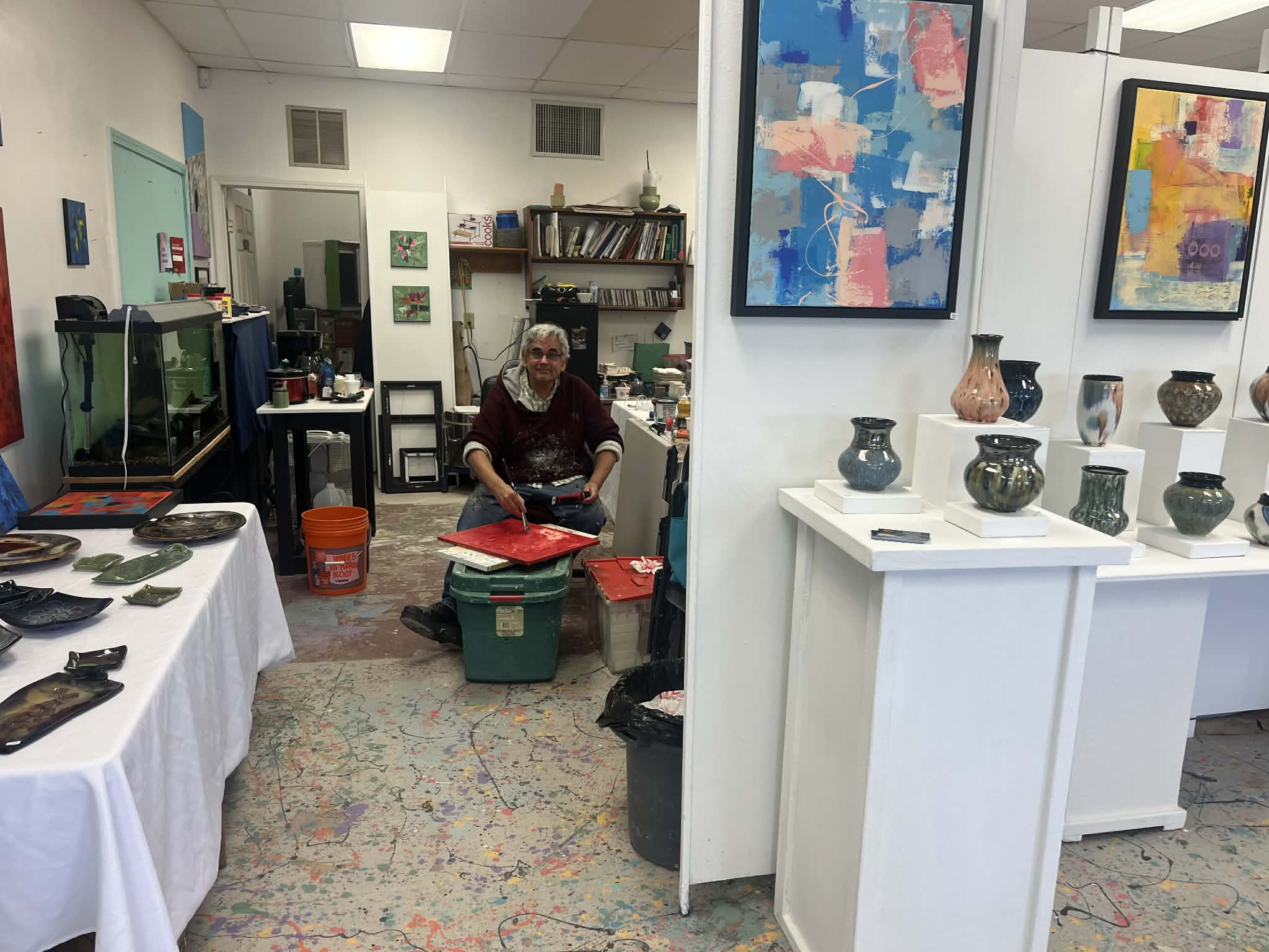 Potter and painter Joseph Pelka strokes a canvas with red paint in the backroom of his studio – having brushed up on his painting during the pandemic. Pelka has long been an artist in Fort Wayne, but says he hasn’t always had a presence in the local market, devoting much of his time to making work and then traveling the country to sell it. Now, as Huntertown grows, Pelka is finding more of a local art market for his pottery and painting close to home. He’s opening his shop, Pelkaclayart, to the public on Fridays, too, where you’ll find colorful displays of his signature vases and pots for purchase beneath abstract paintings. Pelka says his wife, Kathleen, who manages his business operations, makes his art possible, and so far, business has been good for them. “The art business is here now,” he says.
